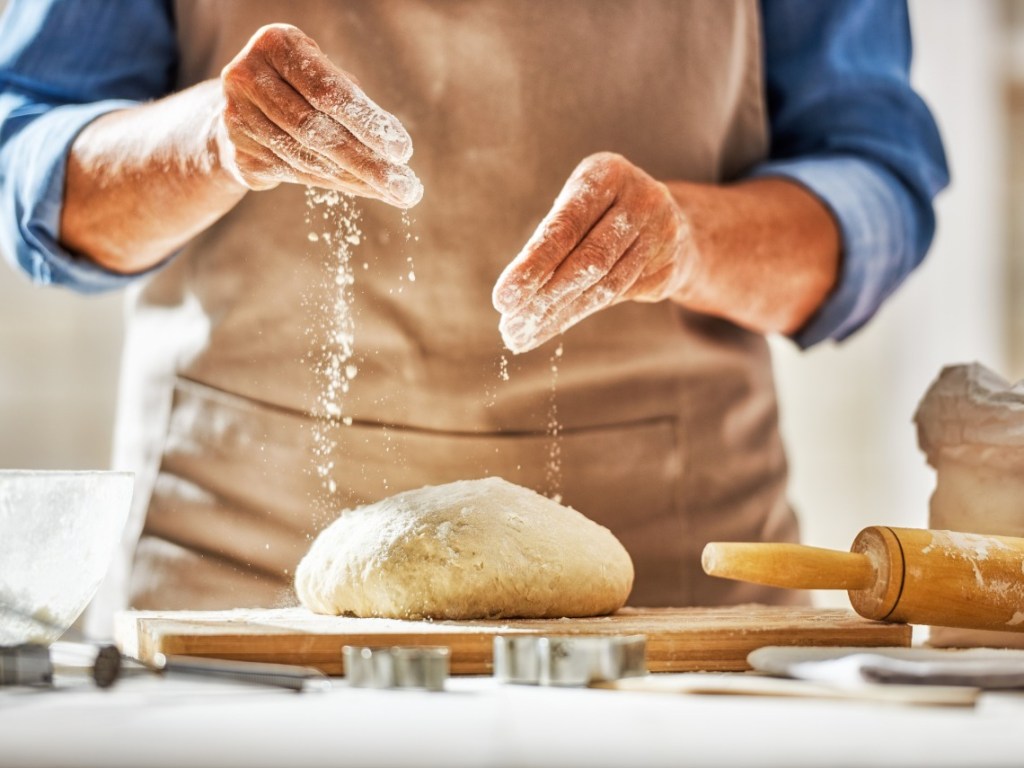La solución depende del tipo de pan que estés haciendo. Variedades como la focaccia tienen una masa líquida para produce burbujas de aire al pan. Para un pan normal, cuanto más lo amases, menos pegajoso se vuelve. La masa siempre está húmeda y pegajosa al principio, pero una vez que la has amasado durante cinco o seis minutos, se vuelve menos pegajosa y más brillante a medida que se desarrolla una especie de ‘piel’, que es la que forma el gluten. Con el tiempo, llegará a un punto en el que la masa ya no estará pegajosa y tus manos estarán limpias incluso mientras amases. Si parece que tarda, simplemente añade otra pizca de harina.