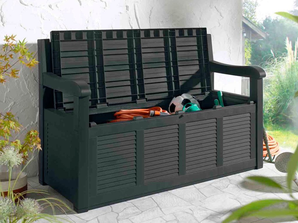 En este caso, se trata de un banco arcón 280 litros con cómodos reposabrazos disponible en Lidl (119, 99 euros). Esta creado con plástico fácil de limpiar y cuenta con un efecto rústico que imita a la madera, y que hace que parezca de diseño.