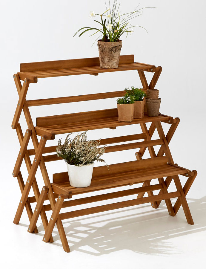 Para mantener ordenadas las macetas de tus flores o plantas, una buena opción es contar con este tipo de estanterías a tres alturas. Este tipo de muebles pueden dar orden visual y además ser un perfecto objeto decorativo.