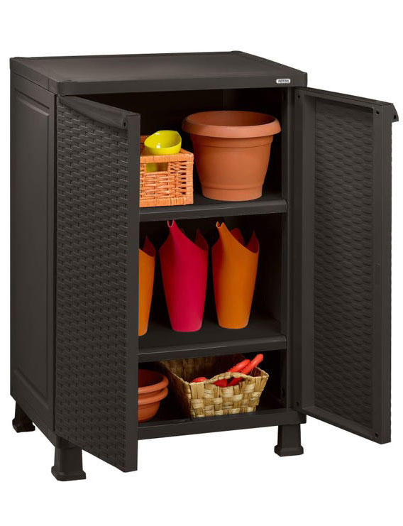 Con un acabado de ratán trenzado en color marrón chocolate, incluye dos baldas con una resistencia de hasta 15 kilos para poder almacenar objetos más pesados: los de la barbacoa, de la piscina, herramientas de jardinería, etc.