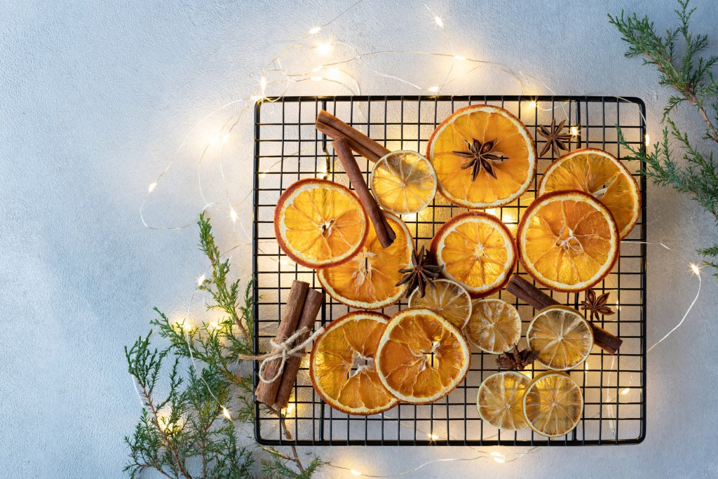 Al mismo tiempo puedes decorar su exterior con fruta deshidrata como la naranja o la pera, atándola al recipiente con una cuerda de cáñamo y completando con rodajas de canela.